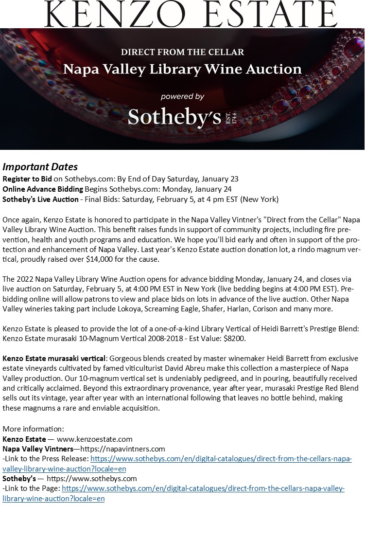 Kenzo Estate invites fans and friends of Napa Valley wines to take part in the exclusive wine auction highlighting unique and exciting vintages from more than 50 vintners - the "Direct from the Cellar" online auction via famed auction house, Sotheby's.